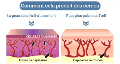 La mélanine est la substance (pigment) qui donne sa couleur à la peau. Une fuite dans les capillaires, causée par de faibles taux de vitamine K ou par le stress, sous la peau est une autre raison majeure. Le sang se répand sous la peau et s'oxyde, ce qui donne à la peau une teinte violet foncé. Cette couleur transparaît à travers la peau et donne l'apparence de cernes.