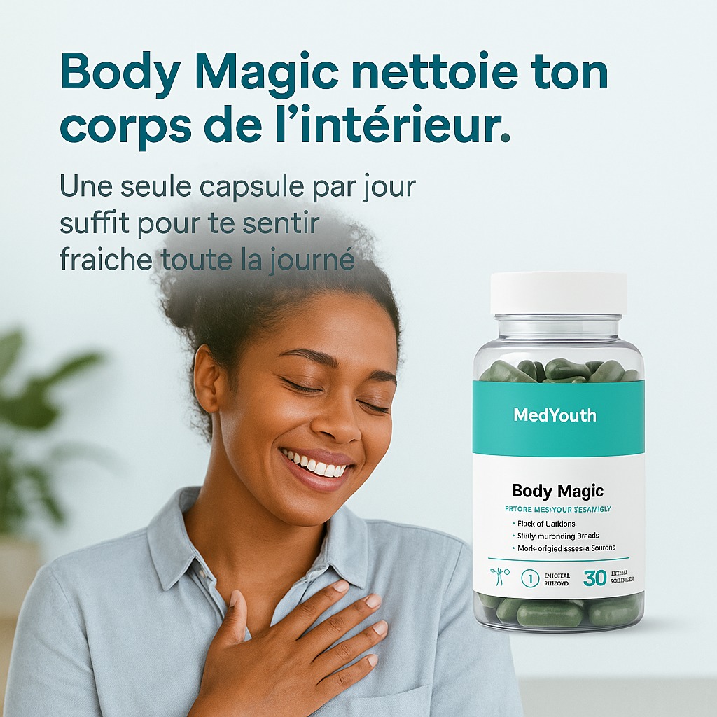 Body Magic est un déodorant interne naturel conçu pour les femmes et les hommes. Il aide à réduire les odeurs intimes, les odeurs des aisselles et la mauvaise haleine en soutenant un équilibre digestif et microbien sain de l’intérieur.