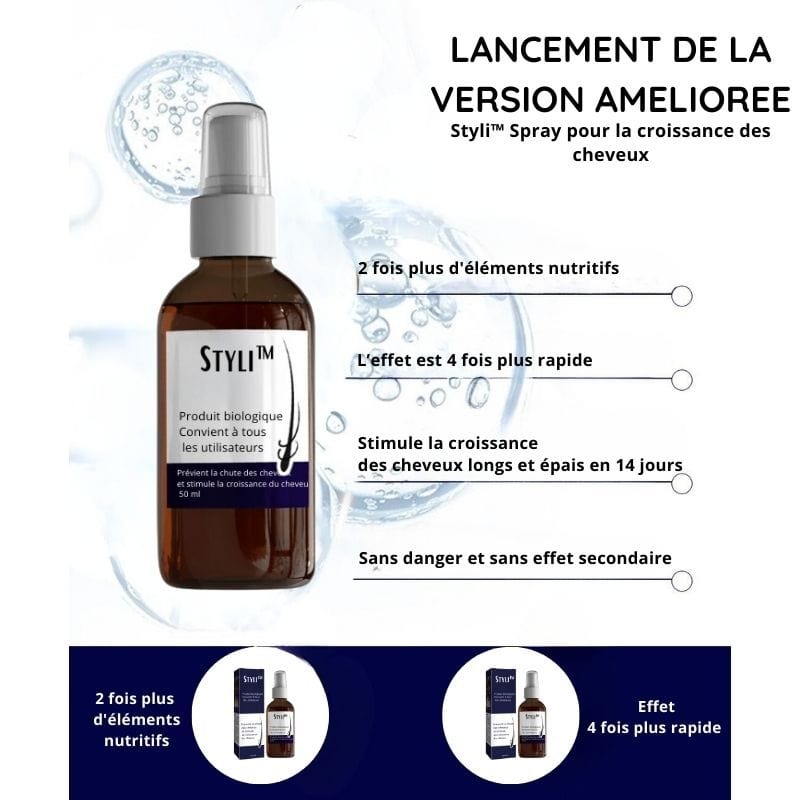 Entre stress, pollution et produits agressifs, votre cuir chevelu est mis à rude épreuve. Résultat : les cheveux tombent, s’affinent et perdent leur vitalité. Styli™ est un spray capillaire 100 % naturel, conçu pour ralentir la chute, stimuler la repousse et renforcer la fibre capillaire dès les premières utilisations. Facile à appliquer au quotidien, il est adapté à tous types de cheveux et offre une solution douce mais puissante pour retrouver une chevelure dense et éclatante de santé.