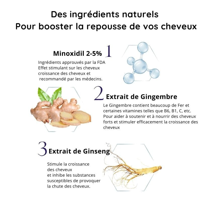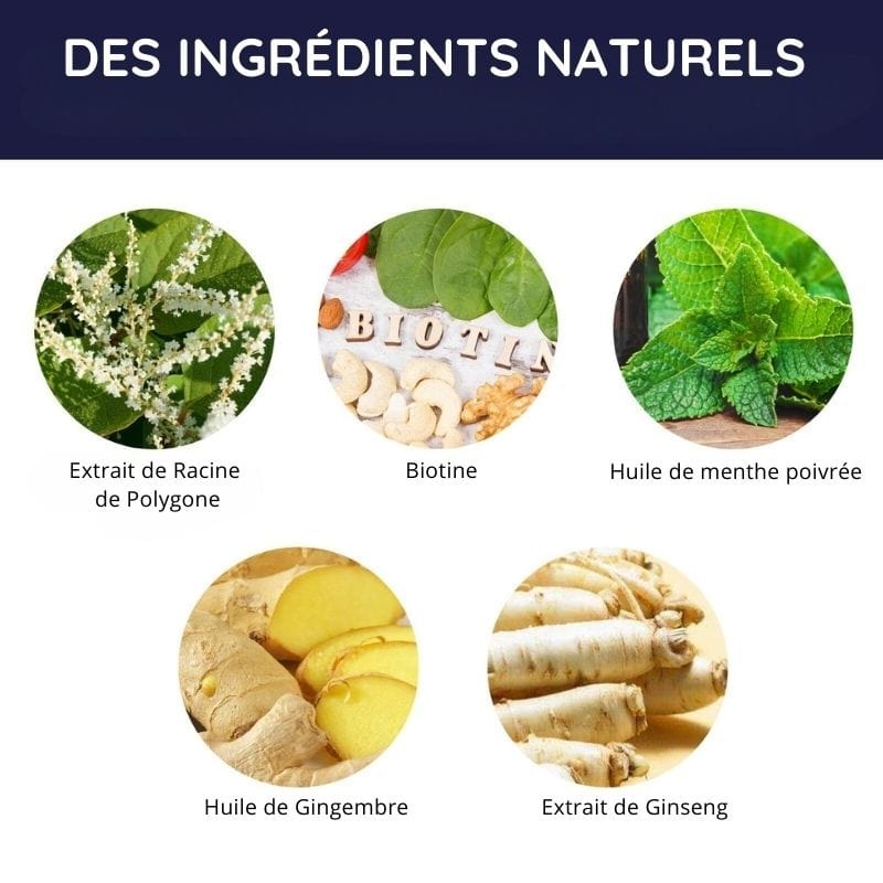 Ingrédients principaux : Extrait de racine de polygone, biotine, huile de menthe poivrée, extrait de racine de gingembre, ginseng