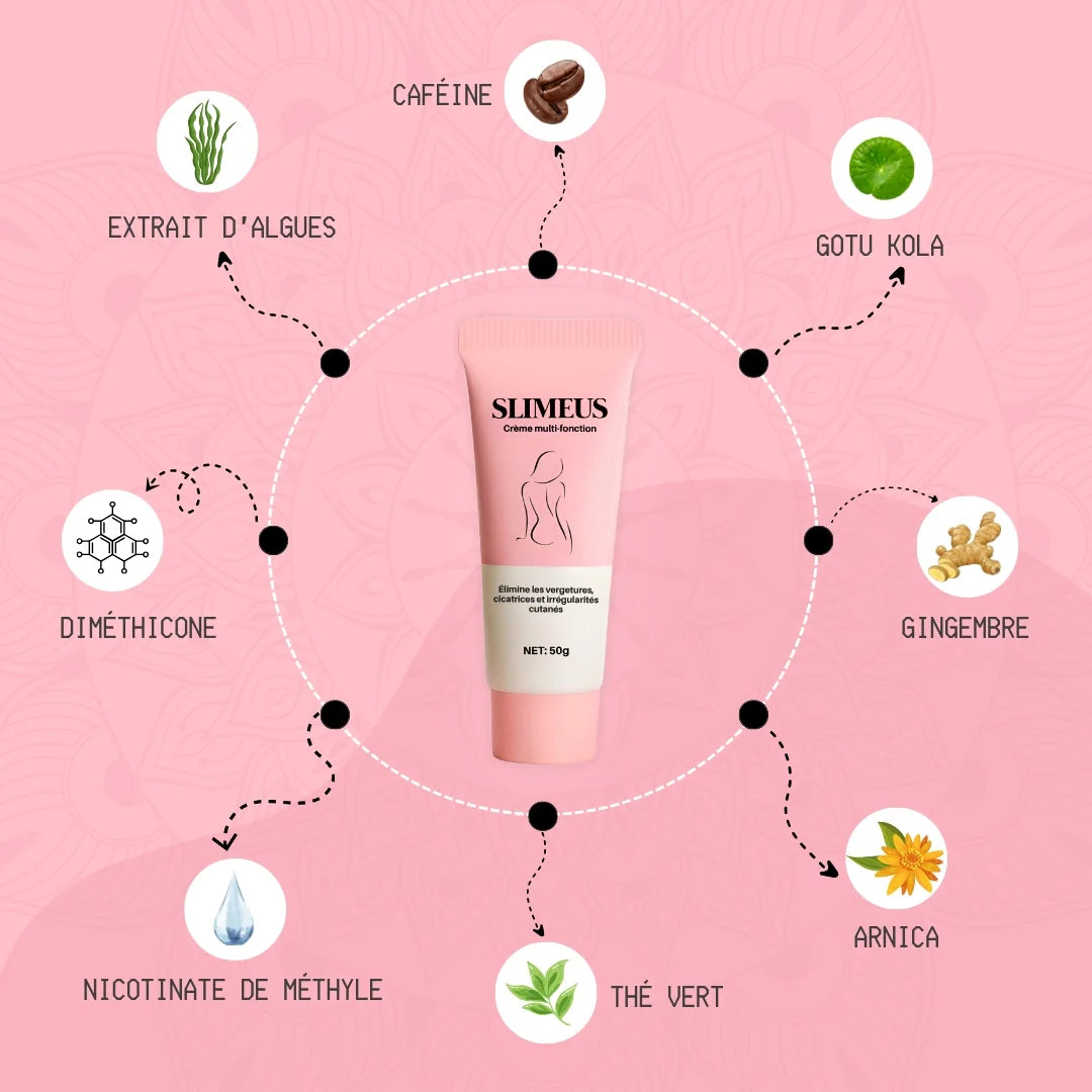 Slimeus est une crème double action qui aide à affiner la silhouette tout en réduisant visiblement les vergetures et cicatrices. Grâce à ses actifs naturels puissants, elle stimule la combustion des graisses, raffermit la peau et améliore son élasticité. Une solution efficace et sûre pour transformer votre corps et retrouver confiance.